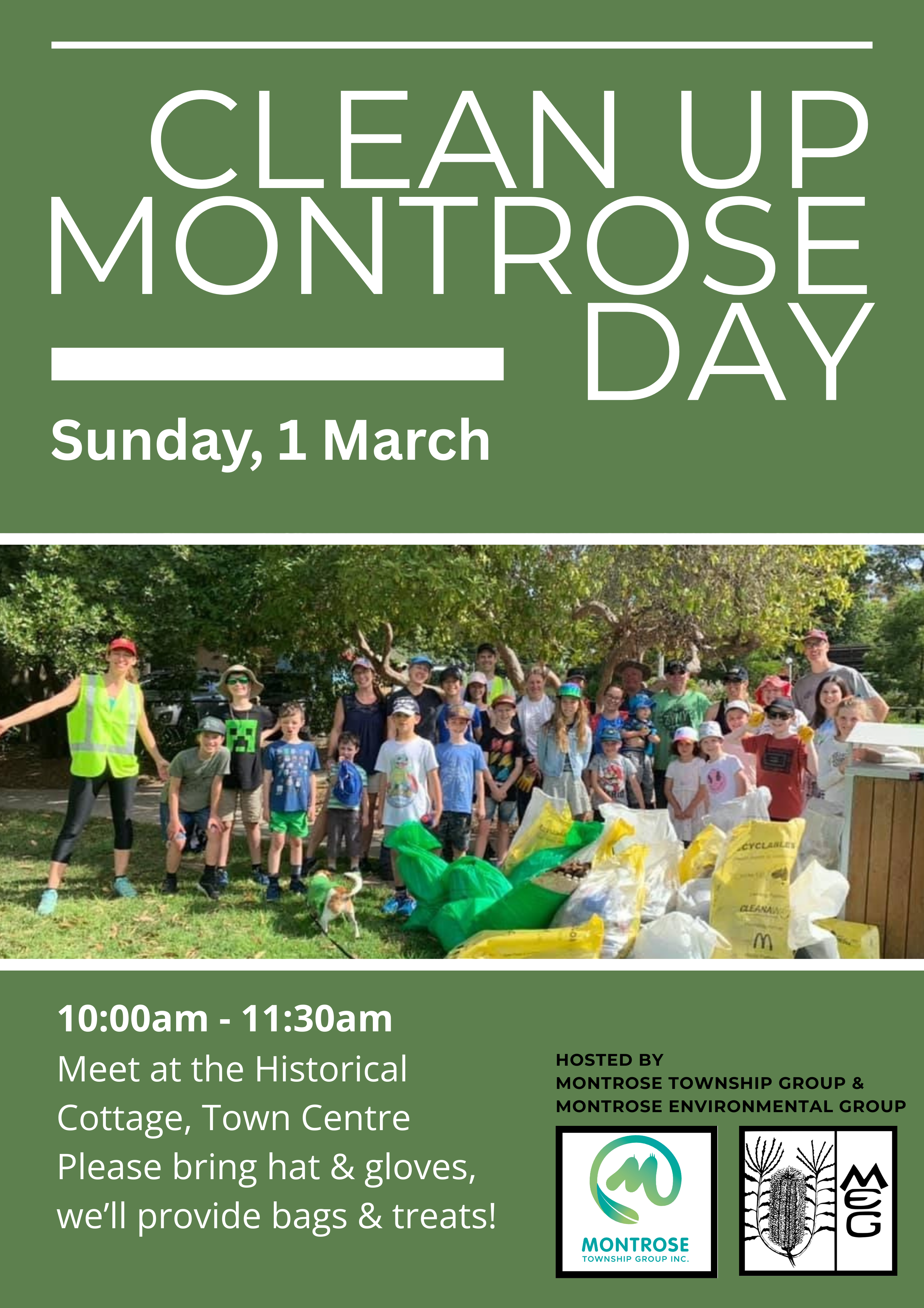MEG and Montrose Township Group are collaborating to host an event for Clean Up Australia Day in Montrose. This will be a family-friendly community event where anyone can make a difference to the local neighbourhood and environment. Rubbish collection will focus on a range of locations in Montrose. Maps wil be provided.